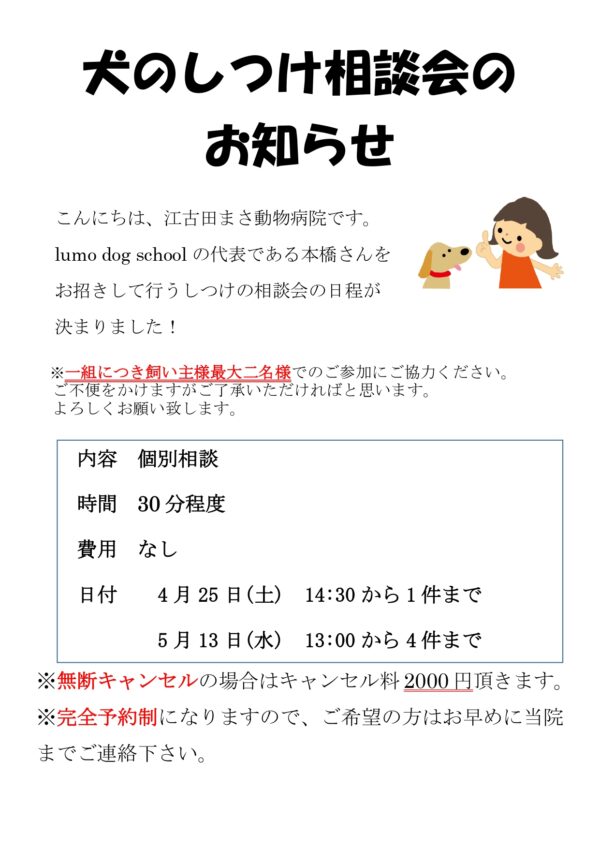 一組につき飼い主様最大二名様でのご参加にご協力ください。